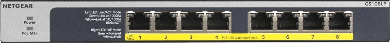 NETGEAR GS108LP është një switch i pa menaxhuar Gigabit Ethernet i dizajnuar për rrjete të vogla dhe të mesme. Ai përmban tetë porta RJ-45 Ethernet që mbështesin shpejtësi Gigabit Ethernet (10/100/1000 Mbit/s) dhe Power over Ethernet (PoE+), duke lejuar furnizimin me energji të pajisjeve të përputhshme si kamerat IP, telefonat VoIP dhe pikat e aksesit pa tel. Switch-i është kompakt me një formë 1U, duke e bërë të përshtatshëm për montim në raft. Ai është dizajnuar për të operuar në mënyrë efikase me një konsum të energjisë deri në 60 W dhe përfshin tregues LED për monitorim të lehtë. Pajisja është ndërtuar për të përballuar kushte të ndryshme mjedisore, me një dizajn të fortë që siguron besueshmëri dhe jetëgjatësi.