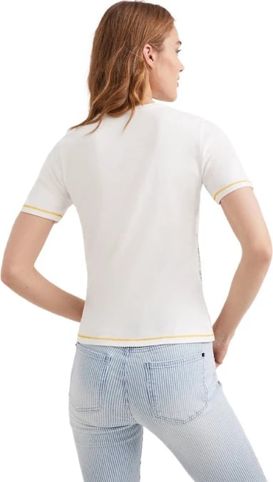 Maicë Desigual për femra, e përshtatshme për sezonin pranverë/verë. Kjo maicë vjen me një dizajn të printuar dhe ka një ngjyrë të bardhë të pastër. E bërë me material cilësor, është ideale për një stil të rehatshëm dhe të lehtë.